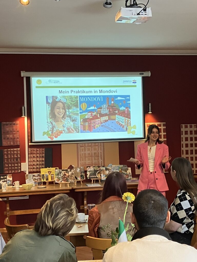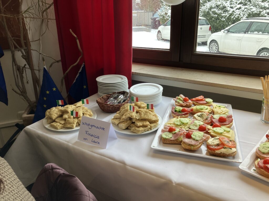 Nach einigen kurzen Worten unseres Teams zum Projekt und dessen Ablauf kamen auch unsere Teilnehmerinnen und Teilnehmer zu Wort, die gerne von ihren Erfahrungen in Italien berichten und den Anwesenden einen Einblick in ihr Leben und ihre Arbeit in Mondovì geben wollten. Zum Schluss überreichten wir unseren Absolventinnen und Absolventen ihre Europässe und der gemütliche Austausch konnte beginnen. Dabei ließen sich unsere Gäste auch das selbst gebackene Focaccia schmecken.